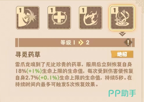 绝招“寻觅药草”则是一个为自己回血的技能,使用后会立刻恢复自身18%的血量,每次受到伤害还会额外再恢复2.7%的血量,这一效果会持续五秒,不过持续时间内最多只能触发五次额外的恢复,有这个绝招的存在,雷爪龙回血的频率会变得很高,持续的承伤能力也因此变得更强。