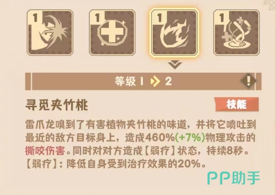 二技能寻觅夹竹桃则是一个兼具输出与减益效果的强力技能,可以对单体目标造成460%物攻的撕咬伤害,同时还能给敌人施加八秒的“弱疗”状态,这个状态会让目标受到的治疗效果降低20%。