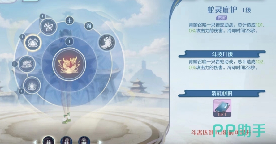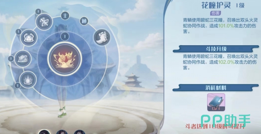 最后青鳞的大招“花瞳护灵”也很不错,使用后会召唤出一头双头火灵蛇来助阵,它的攻击伤害和一技能的岩蛇一样也是102%,不过其他方面的属性会更强,尤其适合帮助青鳞吸收伤害。