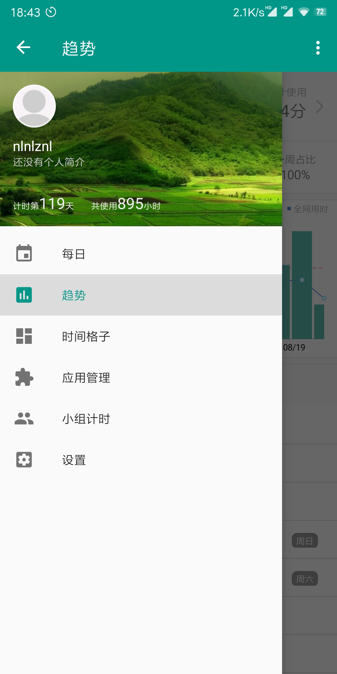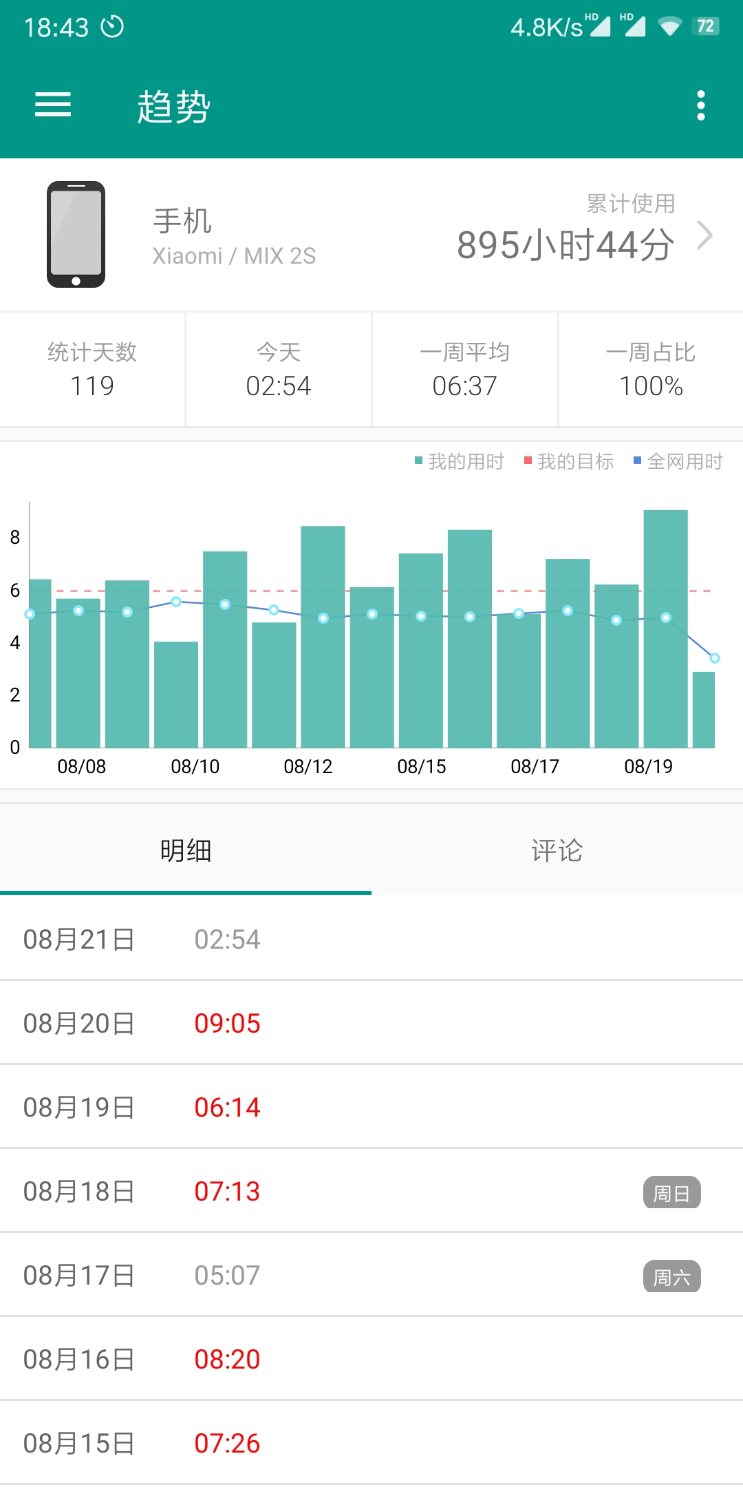 首先我们选择“趋势”,这个功能是可以查看自己手机使用时间的历史记录,以及详细数据,比如累计使用时间,每周平均时间,并且还可以和全网平均用时进行对比。
