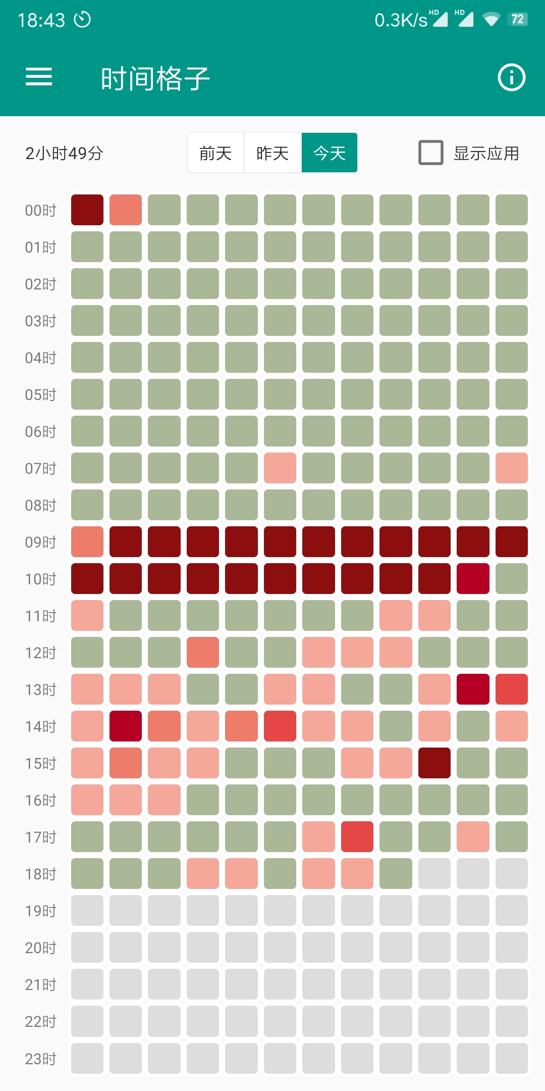 返回功能栏,再点击“时间格子”。在这里可以查看自己的手机都在什么时候使用以及使用的时长。每一个小时分为12个格子,一个格子就是五分钟,颜色越深的格子就代表使用时间越长,最深的颜色就代表使用了五分钟。