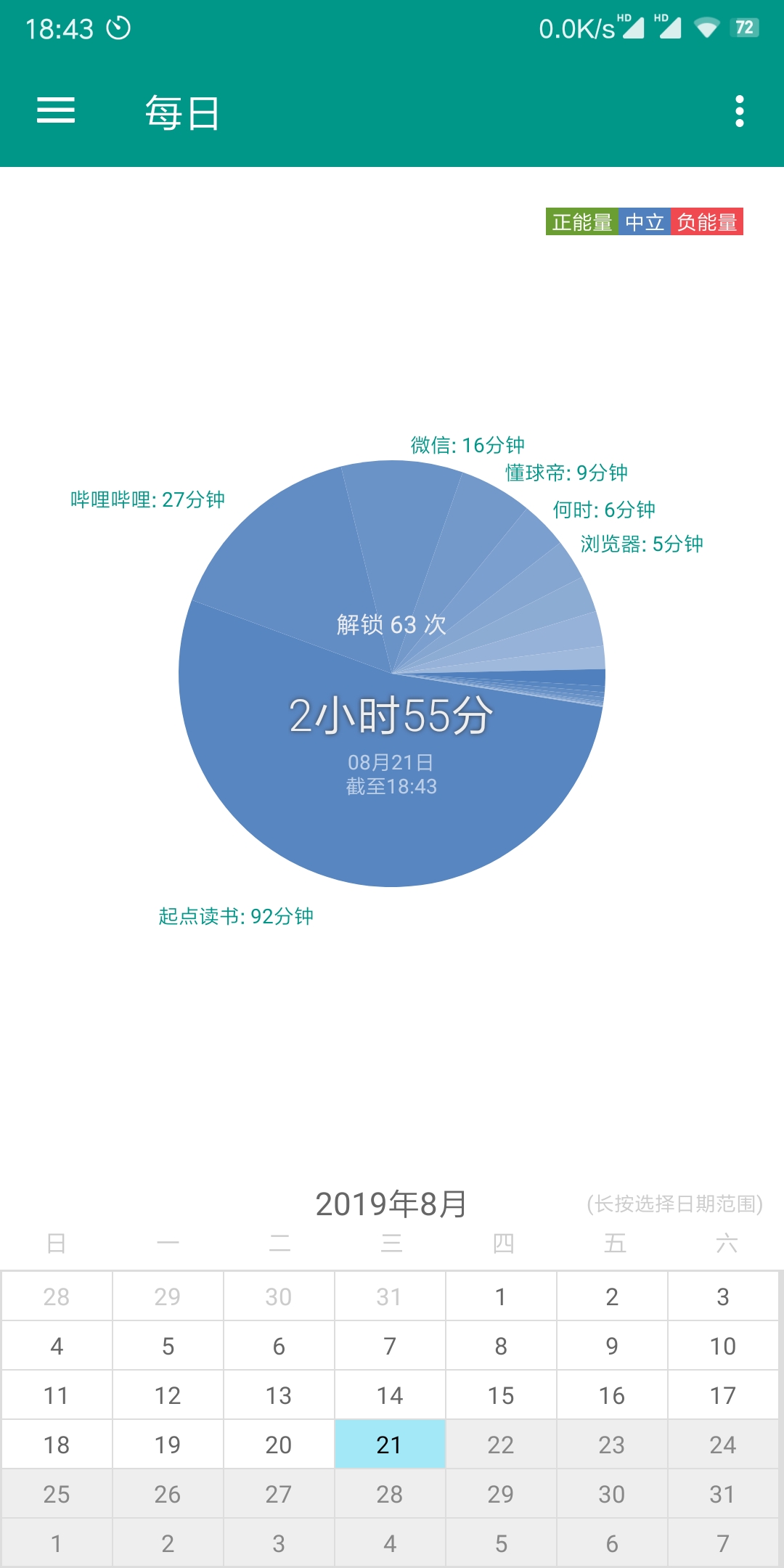 打开app,可以看到自己的手机使用记录,最中间的时间就是自己的手机当天的使用时间,还有每个app分别使用的时间,在下方的日期中可以选择对不同的时间进行查看。