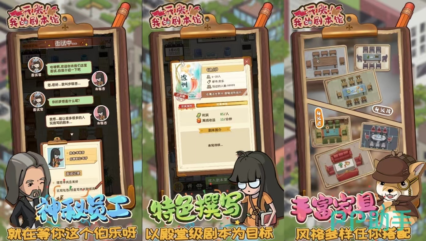 《开张我的剧本馆》是一款剧情经营模拟游戏,玩家在游戏中会作为商业经理的身份,需要为自己的店铺招募店员,招募写手和所有的工作人员。这个游戏的题材是比较创新的,游戏中的每一个剧本都是一个有趣的故事,招募的写手不同剧本的方向也会大有不同。如果有客人来店铺玩剧本的时候,玩家也需要参与其中活跃氛围,在一些剧本中也有特定的服装给玩家。