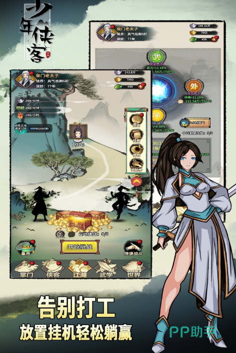 这是一款卡牌游戏,把武侠的招式和卡牌放在一起玩,让你感觉真的进入了武侠世界。你作为一个新手小虾米,在师父的指导下,会变得越来越厉害。游戏里有很多武侠电影里的经典打斗场面,你可以体验到高手之间打架时那种畅快的感觉。武侠技能可以随便调整,你想怎么用就怎么用,可以创造出自己独特的武功招式。简单说,就是让你在游戏中尽情享受成为武林高手的乐趣。