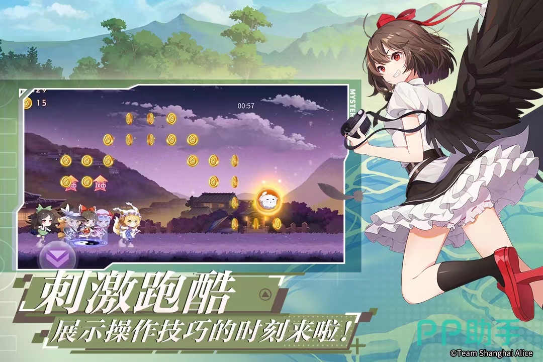 在幻想乡中突然发生异变,一股莫名其妙的力量开始侵蚀这个美好的地方,少女开始了集结,为了美好的故土守护家园,踏上伟大的冒险旅途,二次元跑酷加上弹幕射击式游戏,让你玩的足够过瘾,不断走位躲避指尖跳动,画风很可爱,路上还能收集一些金币以及收集些道具,集结你的伙伴也就是那些可爱的少女,玩法多变让你沉浸在这幻想乡之中。