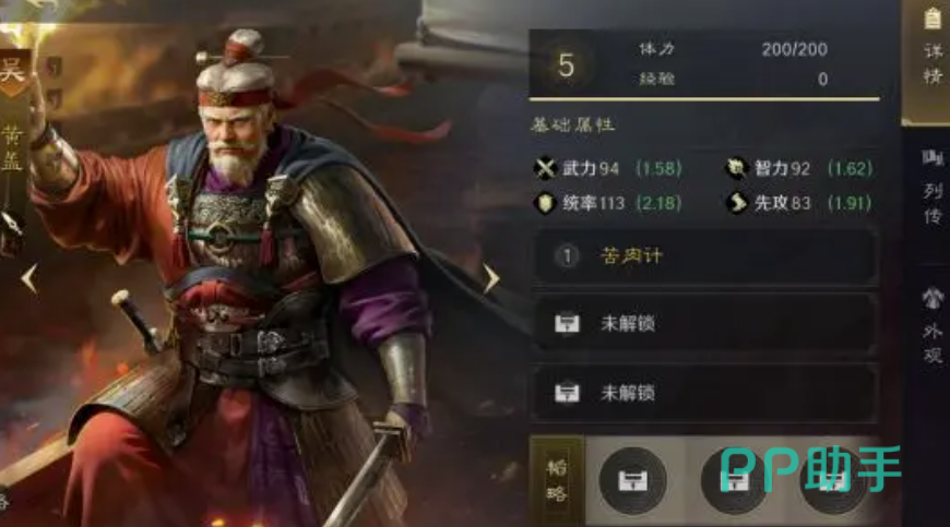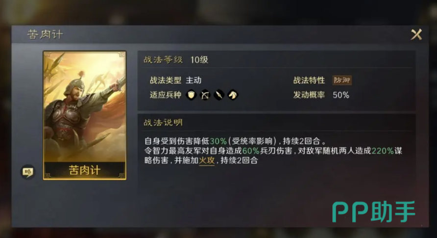 苦肉计是黄盖的主动技能,可以让角色在两个回合之内将伤害从15%降低到30%,而在这个过程当中会让智力最高的己方成员拥有30%~60%的冰刃伤害,另外还会对敌军造成110%~220%的谋略伤害,然后对其发起火攻状态,并持续两个回合,由此可见黄盖的英勇和战斗的大智慧。