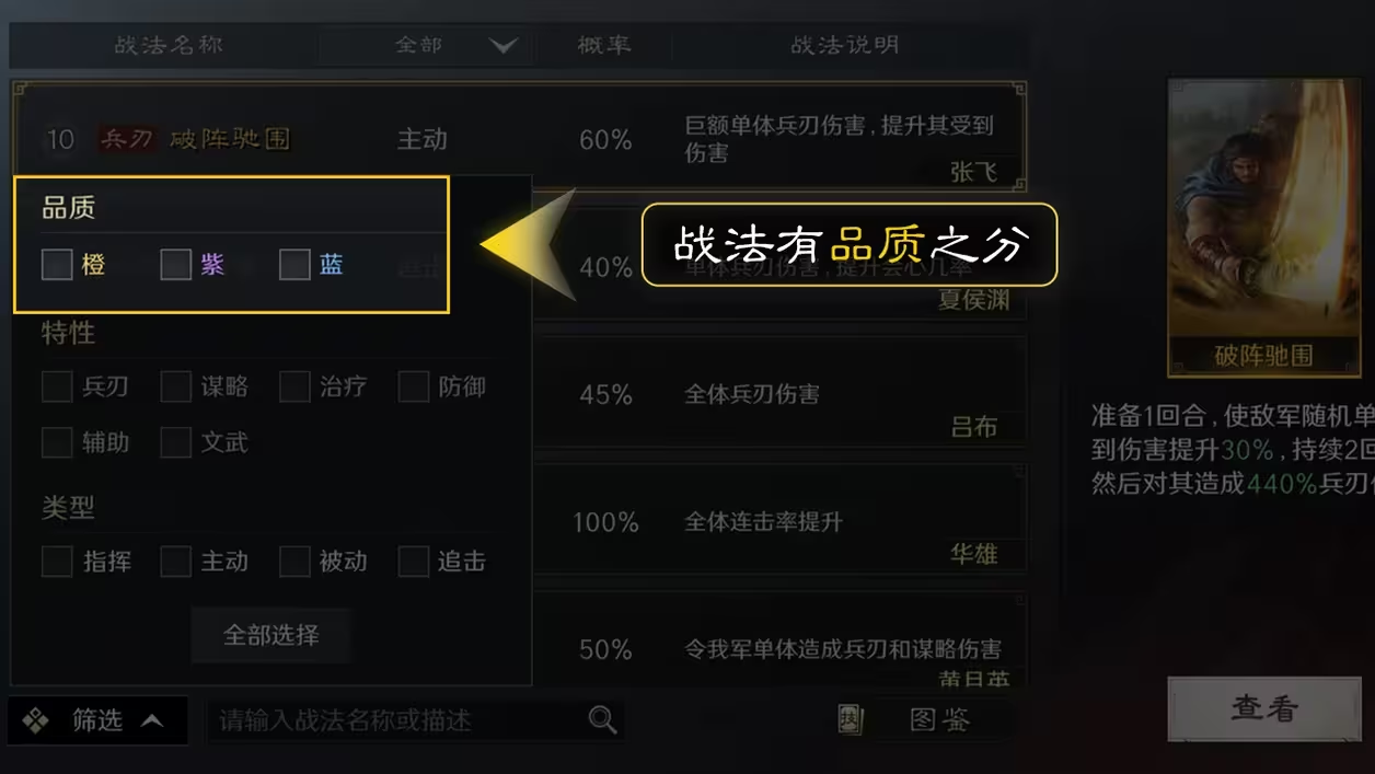 前文提到,武将自带的战法为最优先升级的战法,而后升级的优先级就按照战法的品质了,战法分为橙色、紫色、蓝色和绿色,要按照战法的颜色等级进行倾斜,越靠前的战法越优先升。
