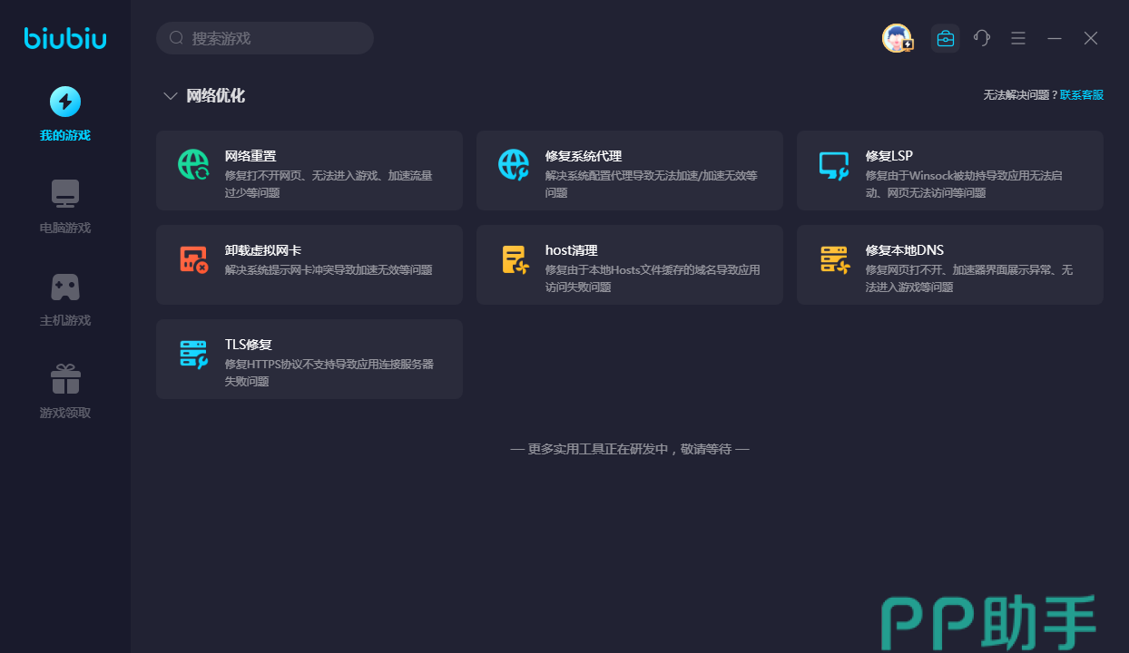 使用biubiu可以解决大家在网络方面的很多问题,除了上面所说的一键优化之外,针对在运行过程中系统出现的其他问题,也提供了一些免费工具。大家可以直接在主页面右上角工具箱中找到这些工具,并根据实际情况去选择使用。例如网络重置、修复本地代理等,这些都可以一键解决很多问题。对于电脑小白来说就无需查找各种攻略方法,直接在biubiu中就能一次性解决。当然也少不了为大家提供各种攻略来解决游戏里的玩法问题,可以直接在专区中免费查看,还可以在社区中去看很多玩家发布的动态,也可以自己在这里发布心情。