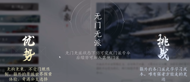 首先游戏设定了十二大门派供玩家选择,其中包括无门无派的高度自由模式,让玩家可以随心发展。除此之外还有天泉、狂澜、三更天、九流门、梨园、青溪、孤云、醉花阴、墨山道、文津馆、无心谷这十一个设定好的门派。这些门派各有其独特的武学技能和门派文化,玩家可以根据自己的喜好和游戏需求进行选择。