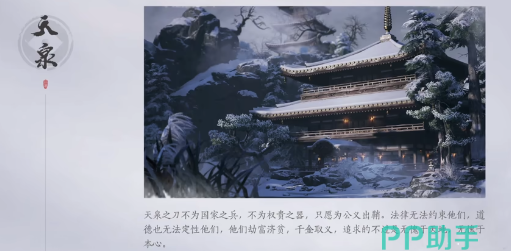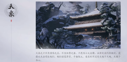 天泉门派重视公义,不隶属于任何国家,不愿为权贵所用。他们的只愿为公义出鞘,玩家选择这个门派,可以体验到一种有个性的江湖生活。