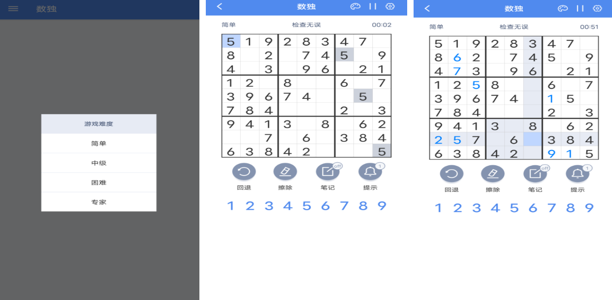 《方块数独》一共有四个难度划分,简单、中等、困难和技能,如果是给小朋友玩的话,建议选择简单模式即可。游戏依旧是9X9的格子组合,玩的时候需要根据格子中提供的数字,推理出其他空格中该填的数。游戏玩法简单,但其中的数字却千变万化,切记1-9任何一个数字都不能缺少。游戏画风简介清新,蓝白色搭配舒适且美观,还有关卡时间记录,可以能让你清晰的看到自己是否进步。