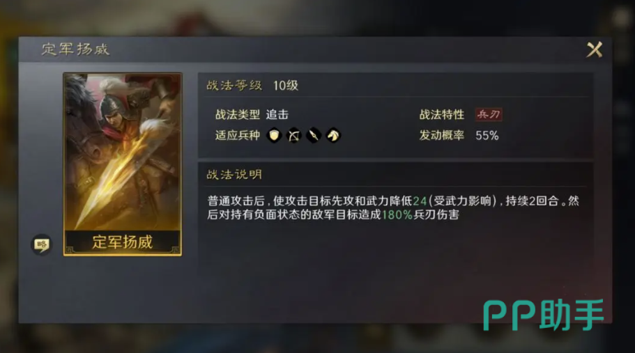 该角色拥有定军扬威追击类型技能,发出普通攻击之后会降低对方武力,持续两个回合之后就会对负面状态的敌军造成90%→180%的大额伤害。每个回合结束了之后,当角色在回合当中时候普通攻击的次数小于两次那么自身的战法发动率和伤害就会被提升30%,而这个效果将会持续一个回合。