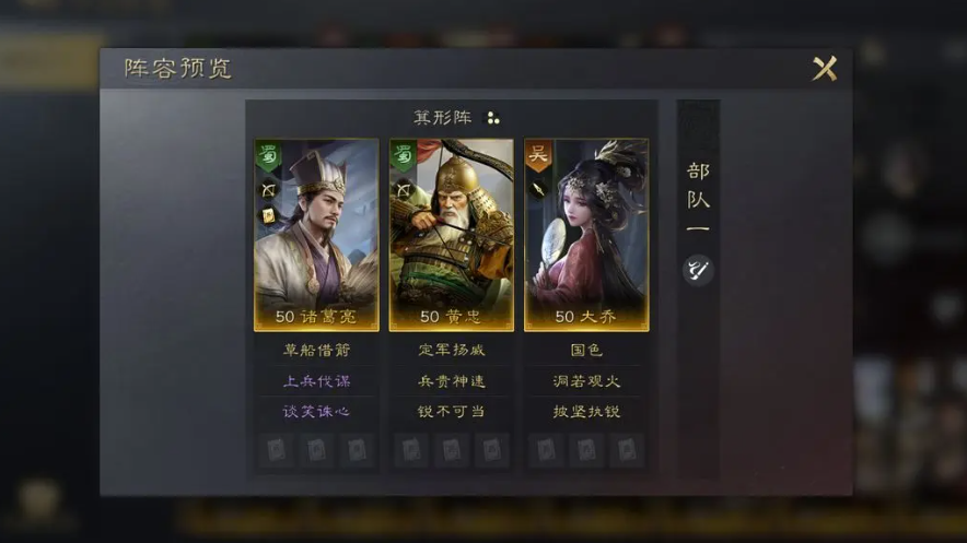 在这个阵容当中诸葛亮是c位,让黄忠在副c位,这样一来白板中的法正速度是最快的,然后恍惚中的控制和法正就可以触发谈笑,最后牵动诸葛亮的自带战法,由此可见改阵容的整体强度就会被提升很多,也是新人比较容易上手的一个阵容。