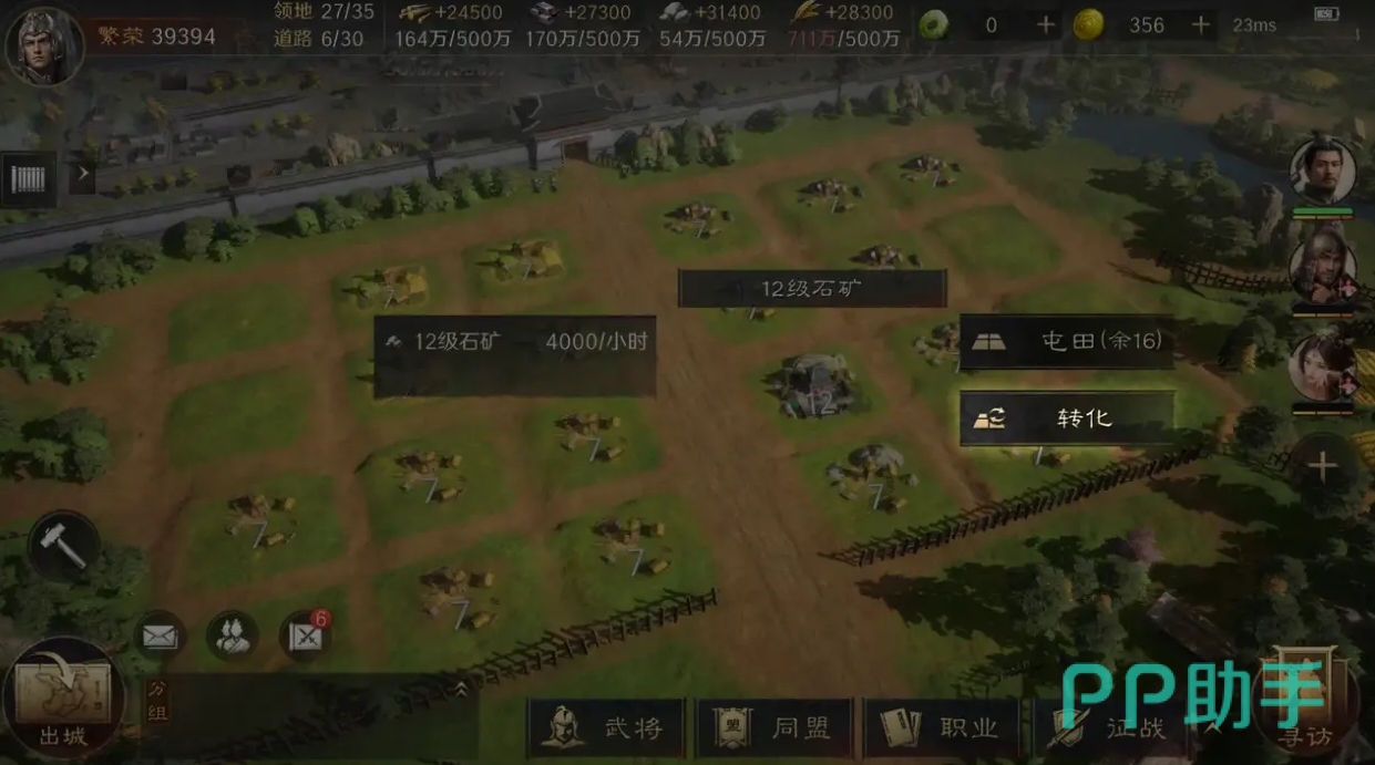 在游戏一开始开垦资源地时,推荐从3级地开始,如果拥有T0级别的阵型,可从4级地开始挑战,为了有效地开发首块资源地,需要为角色配置战法、利用军演和商店等快速去积累铜币,提升技能等级,同时可去利用城镇内的开荒功能去提高游戏内已拥有武将等级增强其属性。
