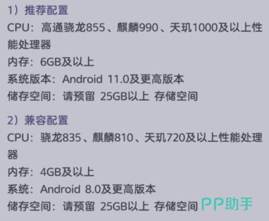 根据相关的游戏公告,可以看出安卓所能运行第二部的最低配置为搭载了骁龙835、麒麟810和天玑720以上的机型,且内存需在4GB以上,还要为客户端余留出25G以上的空间,这样才能让第二部流畅地运行。但若是想获得更佳体验,最好使用骁龙855、麒麟990和天玑1000及以上处理器的设备,内存也要在6GB以上。