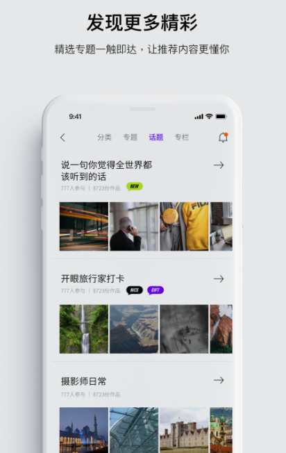 该软件每日都会推送大量的优质短视频和新鲜的资讯,可以和一些创作达人沟通交流,也可参与活动,各种不同风格的类型应有尽有,用户可以根据自己的需求来搜索相应的短视频内容,如果自己也很喜欢分享生活,也能将自己的生活拍摄成短视频,分享到网络上。