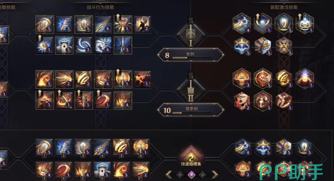 其次在技能方面,优先点两个初始的输出技能,防御被动技能和反击技能,之后把盾牌还有大剑的几个被动技能点到紫色,盾牌反击技能可以点到蓝色,反击盾牌技能需要点到紫色,然后达芬奇点到紫色,一击必杀同样点到紫色,这些常用技能都是要点的。