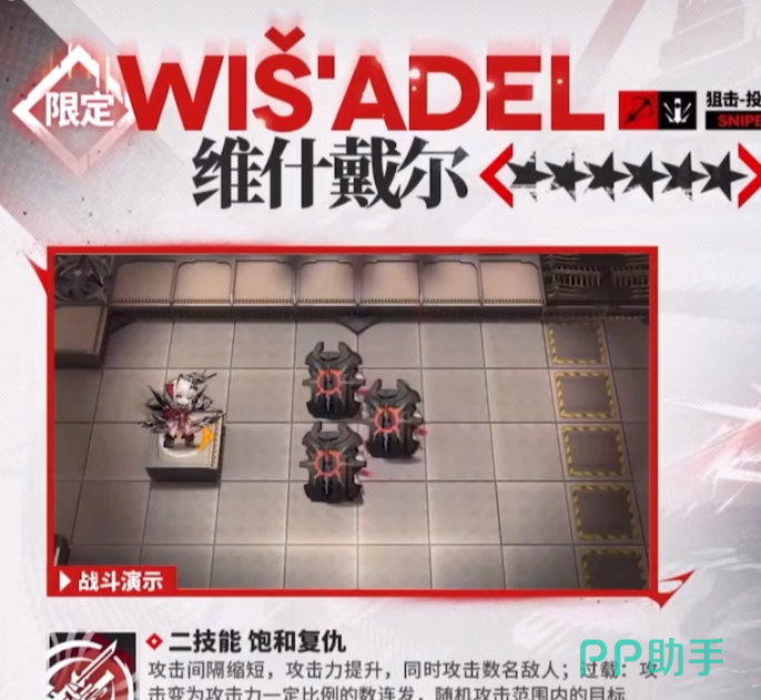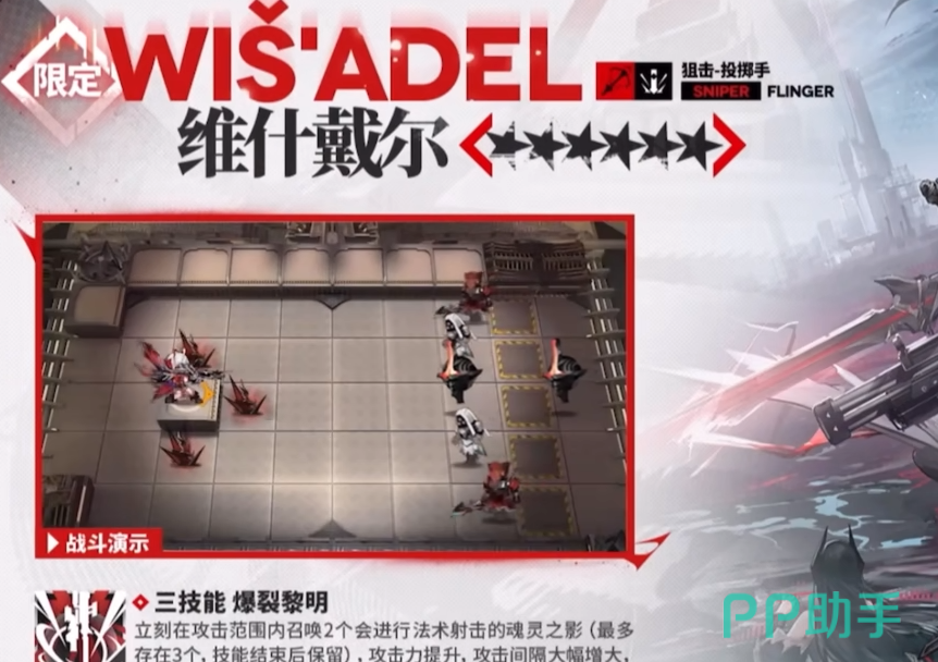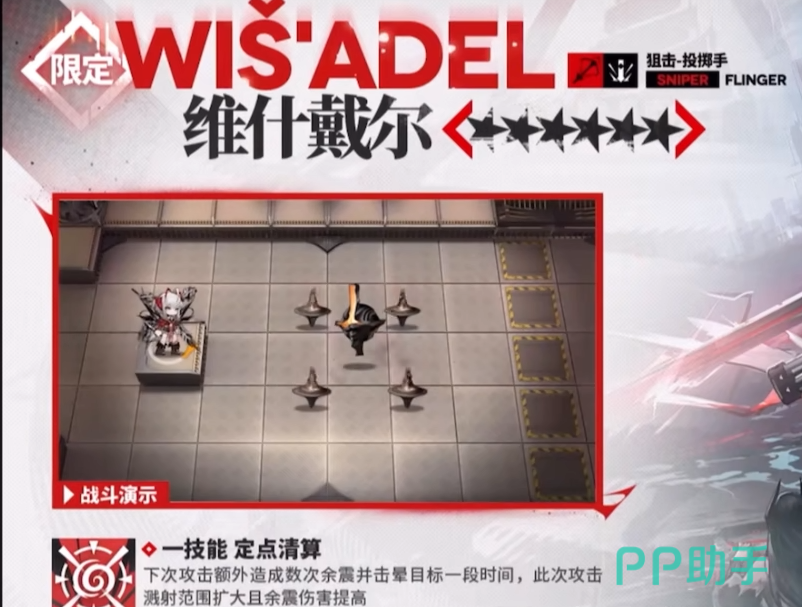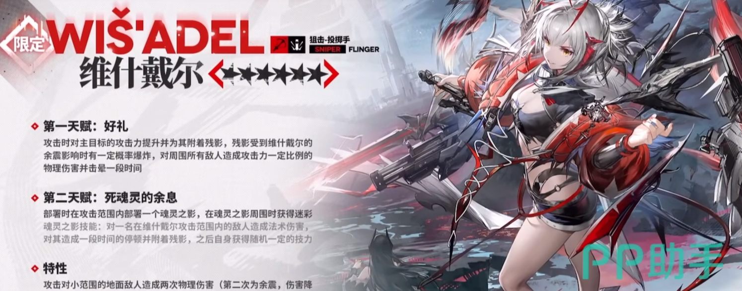在明日方舟游戏中每一个周年庆的6星角色强度都是版本只最,这次五周年为大家带来的六星限定干员是维什戴尔,职业定位是一位六星的狙击投掷手,攻击范围特别大。天赋拥有附加减益效果和爆炸效果,并且能够随着战斗提升 触发残影效果。