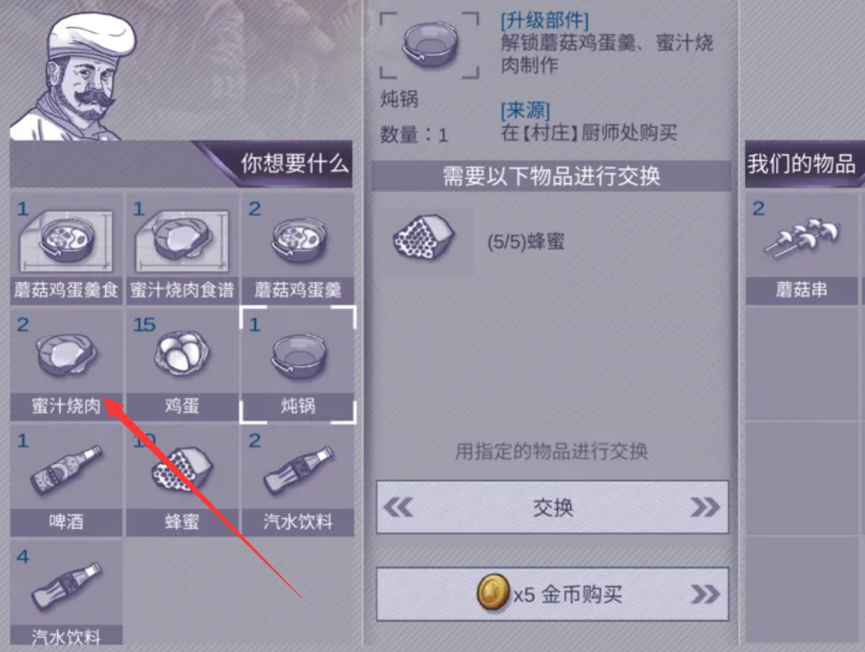 如果玩家觉得收集材料太过麻烦,也可以选择直接与村庄厨师进行物品交换。用5块生肉就可以换取2份秘汁烧肉。这种方法虽然简单,但考虑到生肉在游戏中也是前期相对宝贵的资源,大家还是要权衡一下否值得交换。