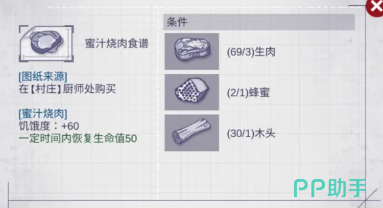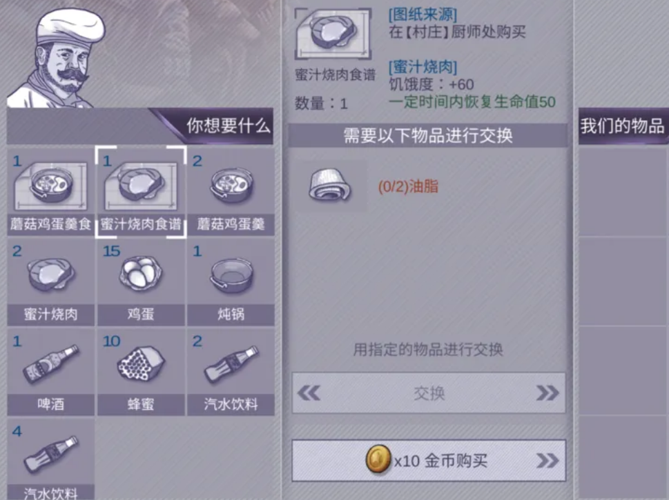 接下来还需要与村庄厨师交换食谱。蜜汁烧肉的食谱需要2个油脂来兑换。油脂是通过狩猎野猪林中的箭猪获得的,这可能需要玩家有一定的战斗的门槛了,并非是一开始就能去狩猎的。一旦获得了食谱和所需的材料,玩家就可以回到庇护所的厨房,点击制作按钮就能开始制作秘汁烧肉了。