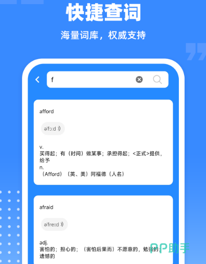 常用的外语学习工具,涵盖小学、初中、高中等多个不同阶段,为用户们提供丰富的词库,只要在线搜索汉字名称或搜索英文单词,就能快速找到,每个单词都有详细的解释,还有具体的使用方法,真正做到学以致用,轻松提升你的效率。可通过其中词汇库积累,还能创建单词库,通过专业的发音,科学的方式加深印象。