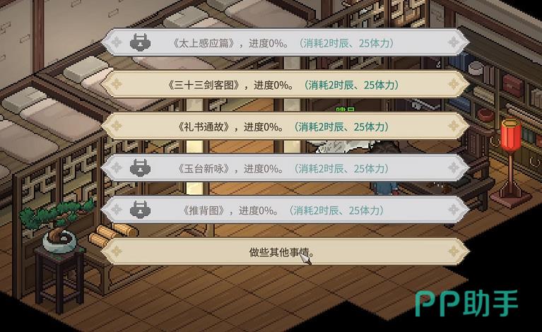 抄书也是提升悟性的途径之一,其中金刚经(丙)、妙法莲花经(乙)、大般若经(甲)分别能为全队提供50、150、200的悟性,而太上感应篇、三十三剑阁图、礼书通故、玉台新咏、推背图能为全队提升悟性250。其中,经书类的书籍存放在藏经阁三楼,其它类书籍则在书院里的宝箱中。
