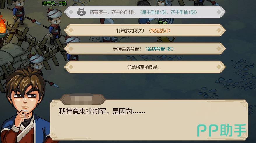 想要前往西南,玩家可先来到十字坡,并从左下方进入十字坡与西南地图的关隘。关隘处有很多人把守,玩家对话后会触发剧情,守关的人会告诉玩家关隘无法随意通行,此时游戏会跳出三个选项供玩家进行选择,且这三个选项均能让玩家通过关隘,分别是持有康王、齐王的手谕、持有金牌令箭和战斗硬闯。