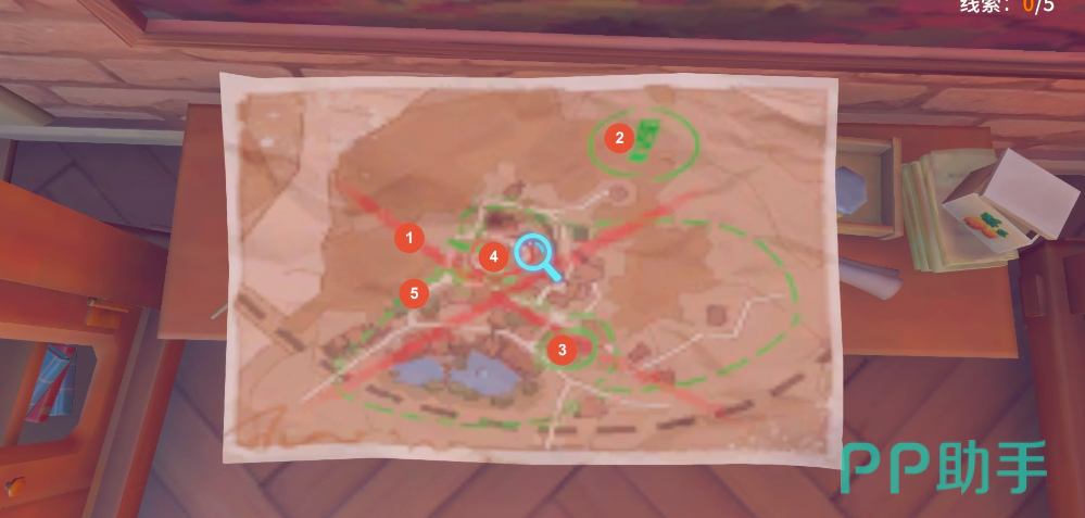之后玩家需要前往一楼大厅当中获得一份地图,在地图当中出现的红叉,绿圈,红圈,绿线和叹号都可以为玩家提供线索。具体的五条线索位置,小编已经在下方以图片形式向大家展现出来,小伙伴们可以赶紧看一看。