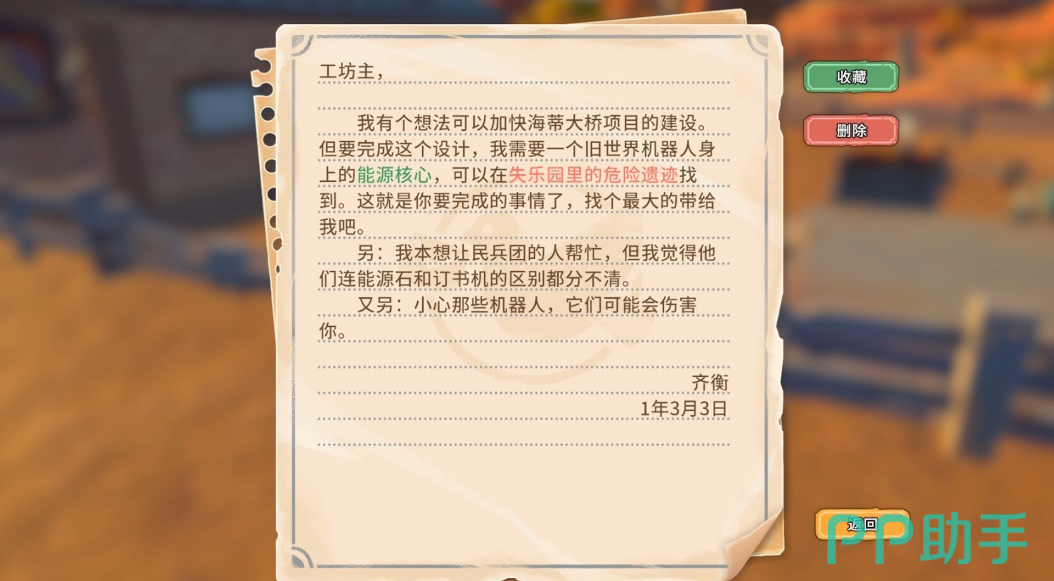 在游戏任务进行到29章的时候,玩家等待npc的同时会收到一封来自于齐衡的信,来帮助玩家建设大桥。他在信中提到可以建造一只新的机器人,加速建设大桥的工程。随后玩家需要来到失乐园的大门口,会发现npc米安已经将大门修好了。