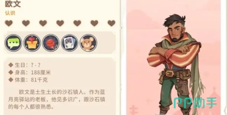 以上就是对沙石镇时光欧文有什么特点的详细介绍,欧文作为沙石镇中的重要角色,独特的外貌、与玩家的特殊互动机制、磁性的声音,以及对沙漠文化的热爱,让这个角色很有魅力。正是这些特点,在众多角色中脱颖而出,成为了国内外玩家心目中最想攻略的人物之一。