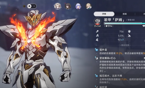 终结技:此时玩家可以进入到完全燃烧的状态,可以提前100%得到强化战斗技能,还有普通攻击技能。完全燃烧状态下就可以提高50点,并且在释放强化普攻之后,可以提高12%的伤害,还能提高50%的自身弱点,击破效率。