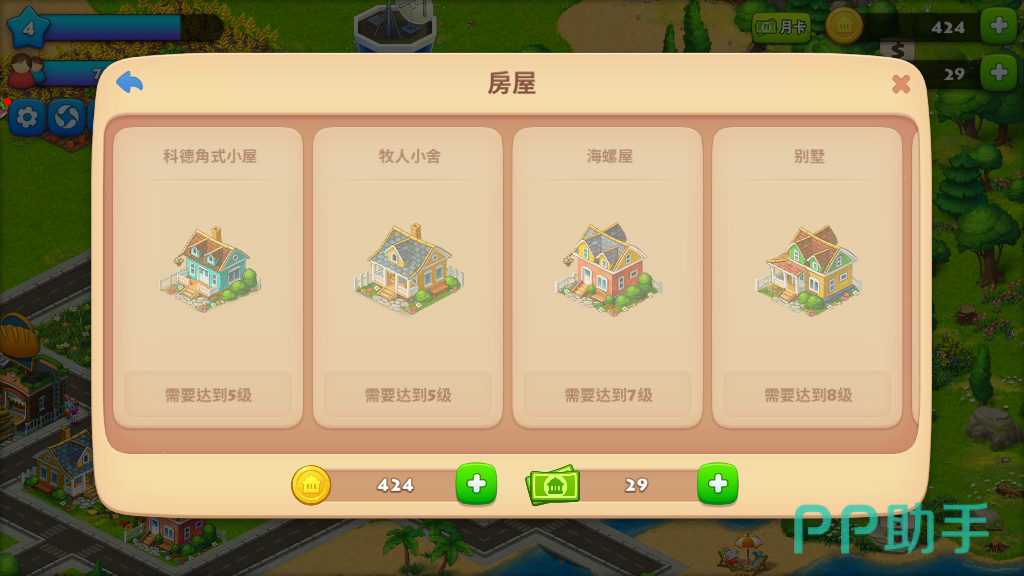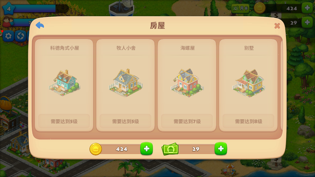 房屋中有科德角式小屋、牧人小屋、别墅、海螺屋、一室一厅房、双层楼房、花园式公寓、公寓大楼等等,可以给居民提供住宿,等级条件达到之后即可解锁进行购买,可以拥有大量的居民,让自己的城镇更繁华。