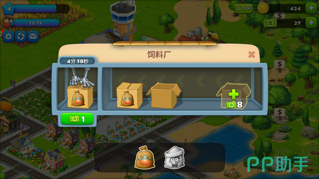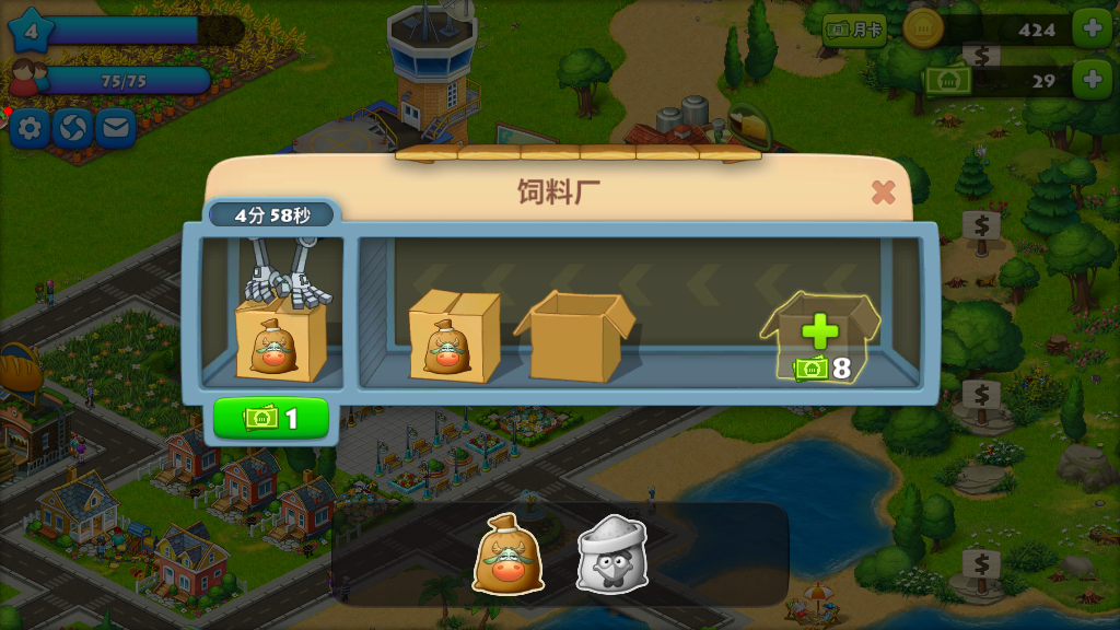玩家需要花费少量的金币来购买农作物、动物。农作物成熟需要一定的时间,动物需要用到饲料,玩家需要购置田地、建设饲料厂,制作饲料需要用到农作物,而制作面包则需要动物生产出来的,从这里可以体现出经营的连锁模式。