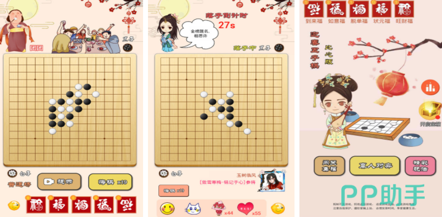 迎春五子棋还原经典的五子棋对战玩法之外,还把游戏里的场景设置成了古风古色的画面,这种设定会让玩家感觉自己回到了大唐盛世,可以一名古代人的身份,感受五子棋对决的乐趣,除了经典的棋局对决之外,还有比较趣味的五子棋玩法,喜欢这种游戏设定的就可以来画生成古代角色参与黑白棋子之间的博弈。
