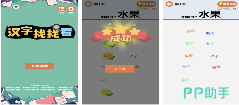 寻找汉字是款具有浓郁华夏元素的找字类游戏,汉字单词填空、成语知识连线等超多寓教于乐的玩法吸引了小朋友的目光,每个关卡都会让玩家反复记忆同一个汉字或者单词,经常玩这款作品的小伙伴都具有了惊人的汉字知识储备。这款跟汉字相关的找字游戏UI界面十分精简,点触式的简单操作满足了大部分小朋友的需求,较为丰富的文字找茬关卡也提高了可玩性。