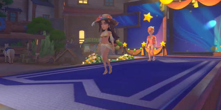 这一次的时装秀泳装主题为暖意,代表沙石镇永不缺席的太阳,所以整体的时装都是以白色和橙色以及黄色为主的,看起来就十分的热情热烈。当中还叠加了一些绿色,整体看起来都清新,生机勃勃。