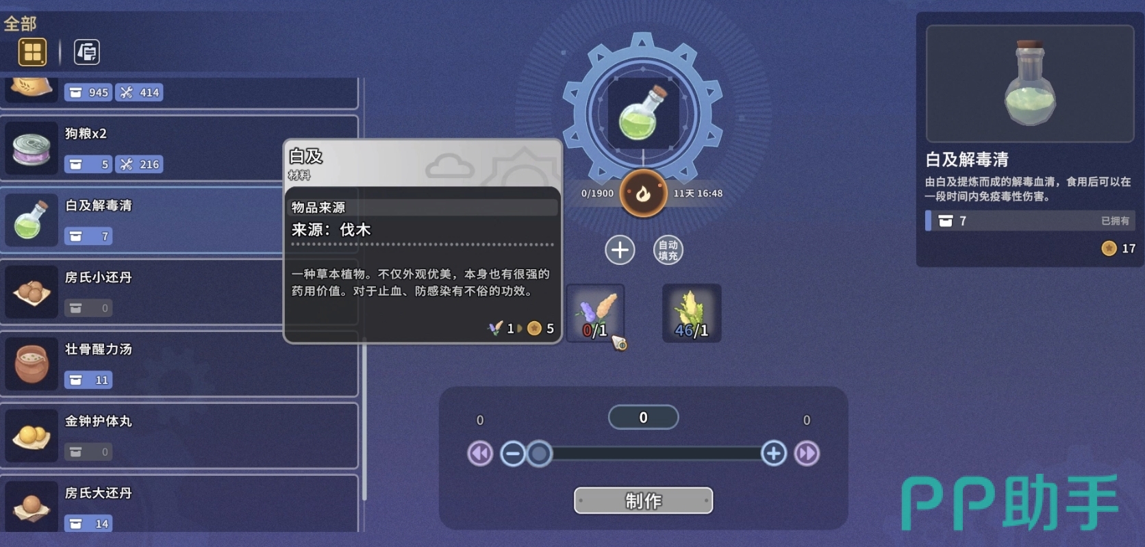 玩家在中毒以后就会持续扣血,一般只能通过读档继续游戏。或者进出工坊,也能刷掉这个状态。然后说下怎么防毒,方便玩家冒险。游戏对付这些毒气的方法有两种,第一种是解毒药剂,名叫白及解毒清。它可以帮助玩家免疫毒气伤害。药品的制作材料则是白及和苦豆子。玩家可以通过采集植物获得这两种材料。具体采集位置则是往小镇西边走,过了桥之后铁路旁边的植物就是了。