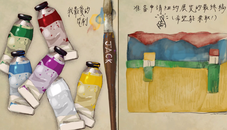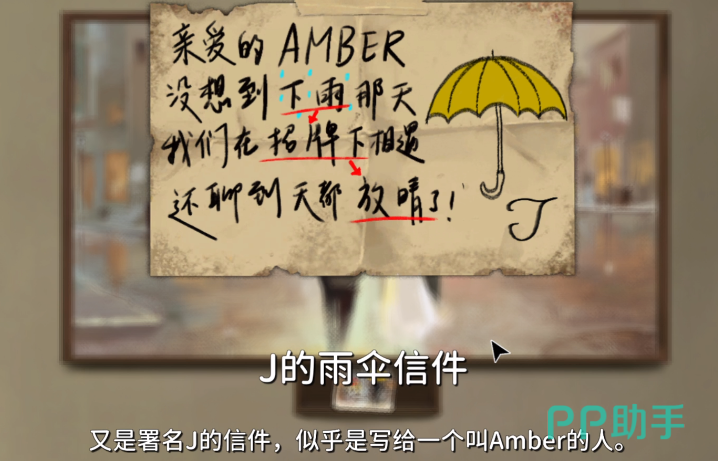 在绘画完成了厨房的色彩之后,玩家会受到一封来自署名J的信件,信件会对关键字进行标记,每一个被标记的关键字都代表了一个密码,玩家通过【下雨】【招牌】【放晴】分别分析出需要的颜色,蓝色、白色、绿色,再使用这些颜料涂抹之前下雨中的男女这张画作,即可完成本章节关卡内容。