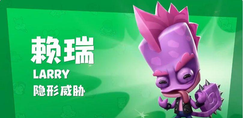赖瑞是一只胆小的蜥蜴,在受到惊吓的时候会浑身发抖,不过他的被动粘性的舌头十分实用,可以将距离最近的战利品拉到自己的身前,在争夺高阶武器的时候可以远离危险,主动技能是“保护色”,可以获得五秒的隐身时间,将从敌人的视野中消失,敌人就无法锁定并且攻击他了,不过不能靠近敌人太近。
