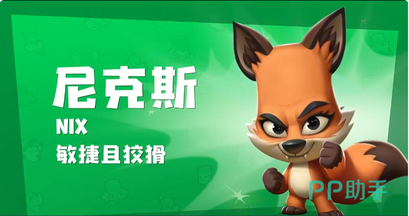 尼克斯是一个意志坚定,有勇有谋的小动物,虽然来到动物园的时间并不长,但是会在某些时候想极力展现自己,想要成为主导一切的领袖。“冲刺”是一个主动技能,这个技能使用之后,他会向前面快速进行冲刺,是一个能快速接近对手,或者快速进行撤离效果的技能,可以让他在追击或者闪避的时候快人一步,从而将容错提高;“快手”是他的被动,就跟字面上的意思以上,可以以比对手更快的速度将战利品拾取起来,这样就能快人一步拾取武器,落地刚枪的时候就能够抢占先机;“冲刺击退”作为终极技能,会向周围释放出击退波。