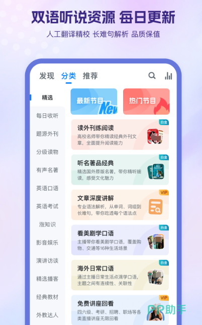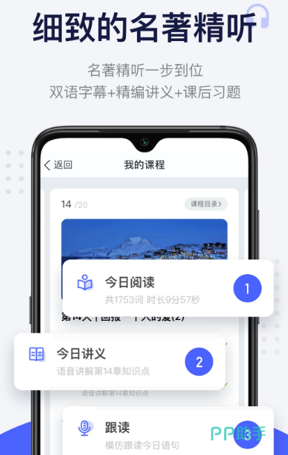 家长也可以到这款软件上来辅助家里的孩子学习英语,零基础入门让您快速的找到学英语的方式,它涵盖了单词背诵、能力提升等这些方面的需求。拥有多样化的精选视频素材,还有名著精讲、外刊精读等一系列的功能,如果觉得自己发音不标准,可根据智能实时口语评分来逐句练习。