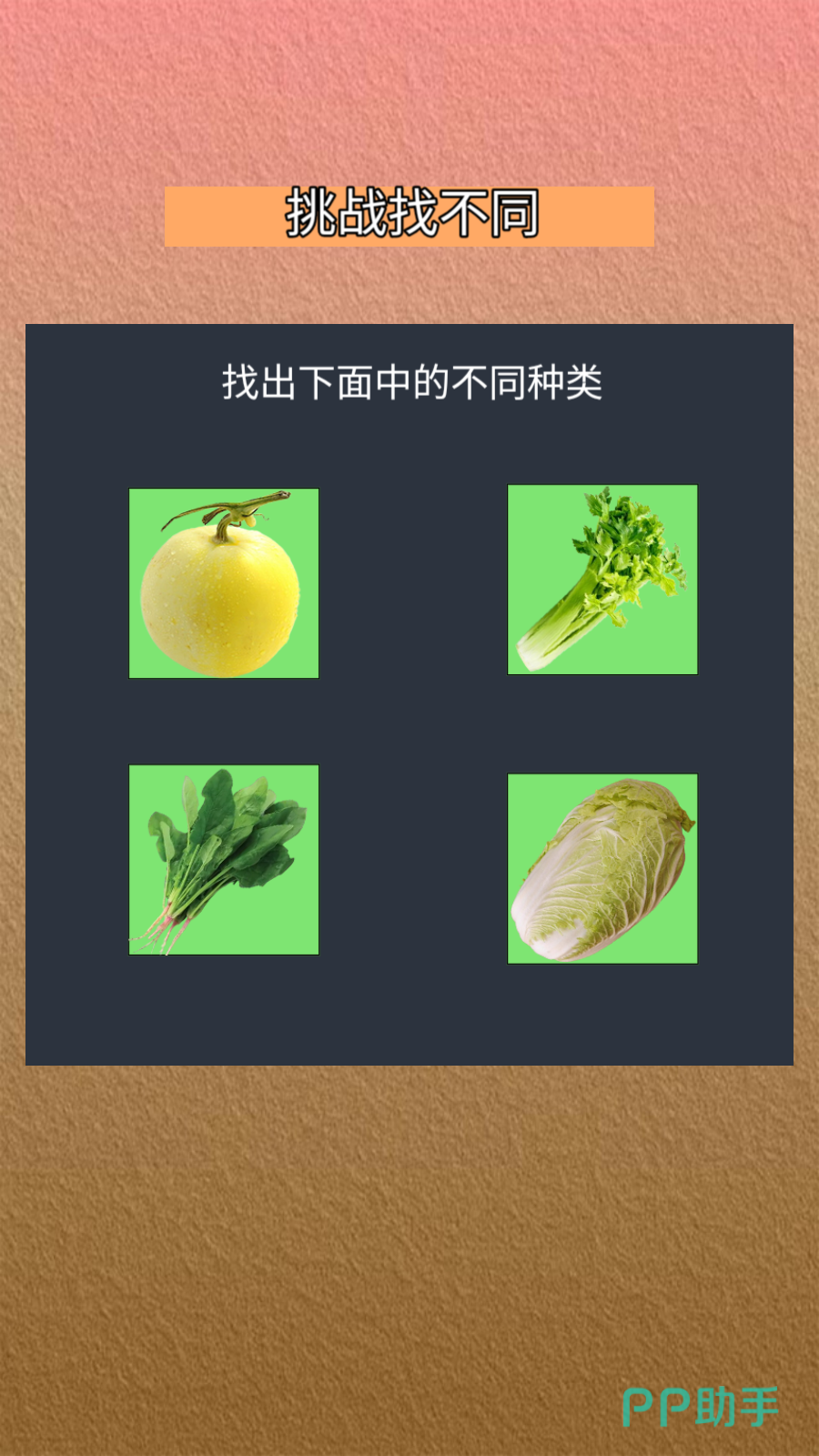 在这款游戏中界面会罗列出4个图片,你需要根据游戏标题寻找不同类别的物品,你不用担心时间结束,这款游戏中时间是无限度的,玩家在玩的过程中不会出现压迫感,可以慢下节奏来去探究不同,还可以认识自己不认识的东西,有些关卡出现的要求是玩家无法想到的,内容的不同,让游戏更耐玩,当你不知道哪些是不一样的物品时是可以使用专门的道具进行通过关卡。