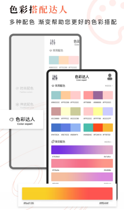 渐变色在制作的时候,的确需要有一定的颜色拼接基础,这款应用就是为配色者专门设计的,不管自己是初学者还是专业的人员,通过里面提供的多种配色方式,既可以帮助自己进行色彩搭配,也能寻找更多的配色灵感。由于里面的颜色多种多样,一个颜色当中也会因为色调不同会有一些区别,所以在制作渐变色的时候特别容易。