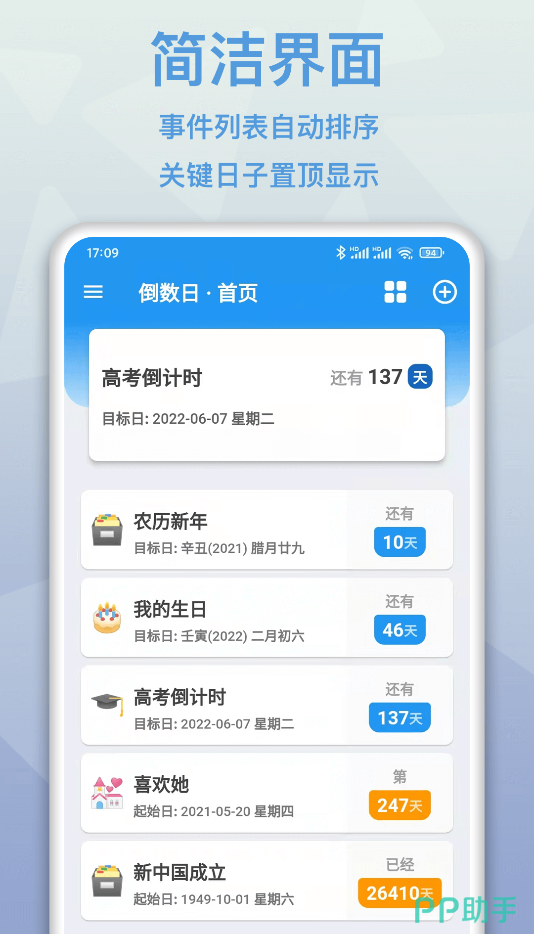 记录美好生活和记录日子就用倒数日倒计日,农历和公历的日子都可以设置操作,多种默认的分类记录不同的日子,有节日、爱情、工作、学习、旅游等,还能防止数据丢失。