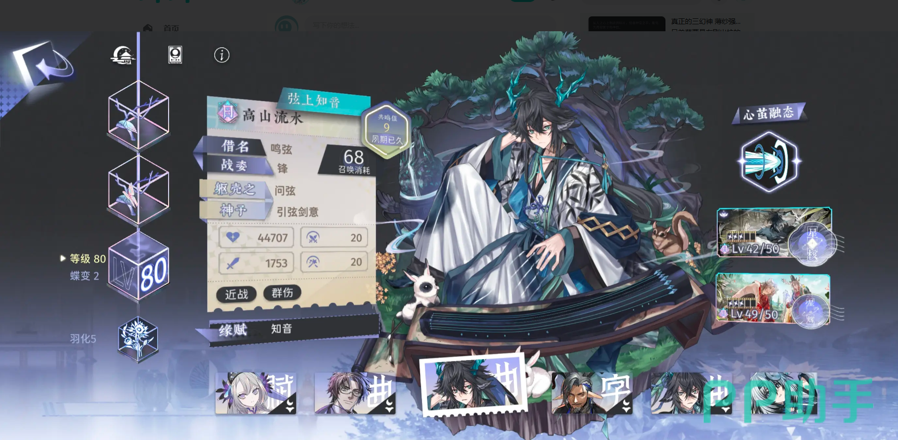 鸣弦在游戏中又被叫做高山流水,战姿为【锋】,稀有程度为日六星,在队伍中一般负责近战攻击,以及对敌人造成群体伤害,召唤消耗为75。在游戏中,高山流水的人气目前达到了TOP1的级别,他的强度也让他成为了现在出场概率最高的角色。由于咏月风雅这款游戏战斗玩法的特殊性,玩家们可以在同一个队伍中上场两只高山流水,大家可以凭借这个阵容轻松避免前期卡关。高山流水的攻击带有真实伤害,且所需费用很低,在赋缘知音的情况下,可以说是无敌的存在。他的生命值在八十级时可以达到44707点,攻击力为1753,优秀的面板也让他的技能伤害更为可观。