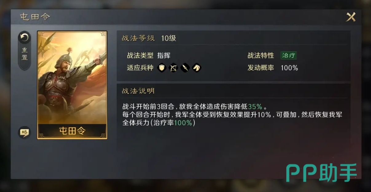 他的自带战法屯田令能对敌我双方的全体造成伤害降低35%,并且每回合都能提升我军的治疗效果,该效果可持续叠加,使得随着战斗的进行,我军的治疗能力也会得到逐渐的增强。