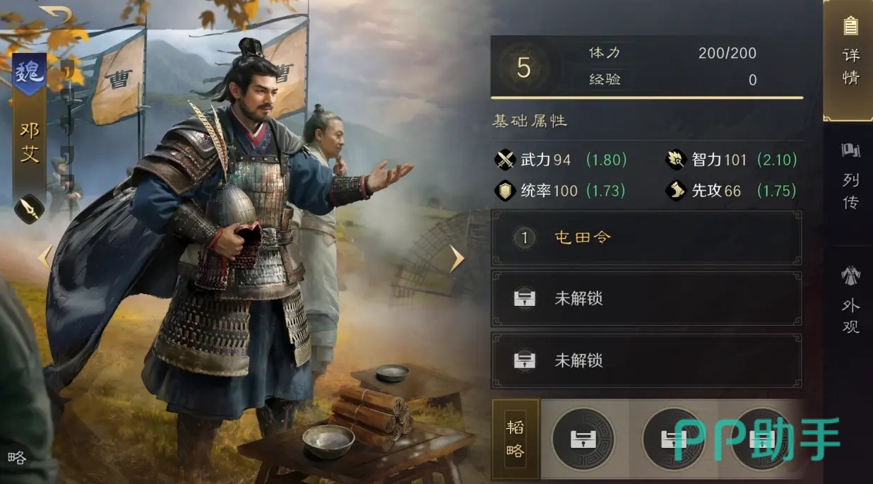 大家如果有解锁该武将的话,就会发现邓艾的智力属性相当的突出,在游戏中是位典型的指挥型武将。