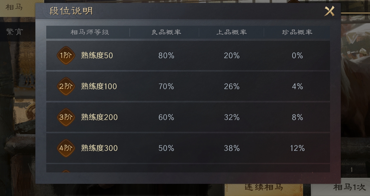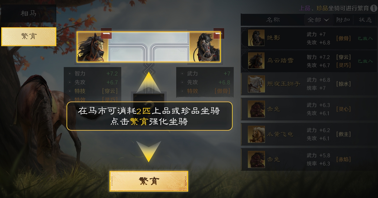 坐骑的培养其实主要也是通过繁殖来进行,繁殖是当下游戏中提升坐骑能力的唯一方法,玩家要在马市消耗两匹上品或珍品级别的坐骑来进行繁殖,如此就能够有机会得到新的技能或效果,能够让大家更好的去提升坐骑的品质,而繁殖出的坐骑有可能会提高基础属性,并有机会出现新的特殊技能以及效果。