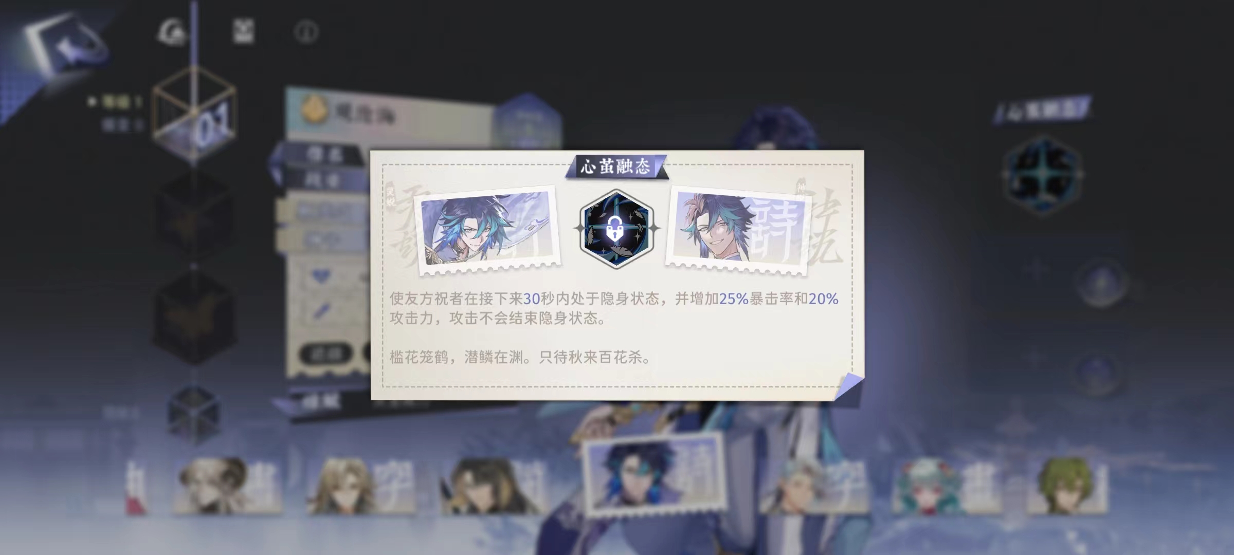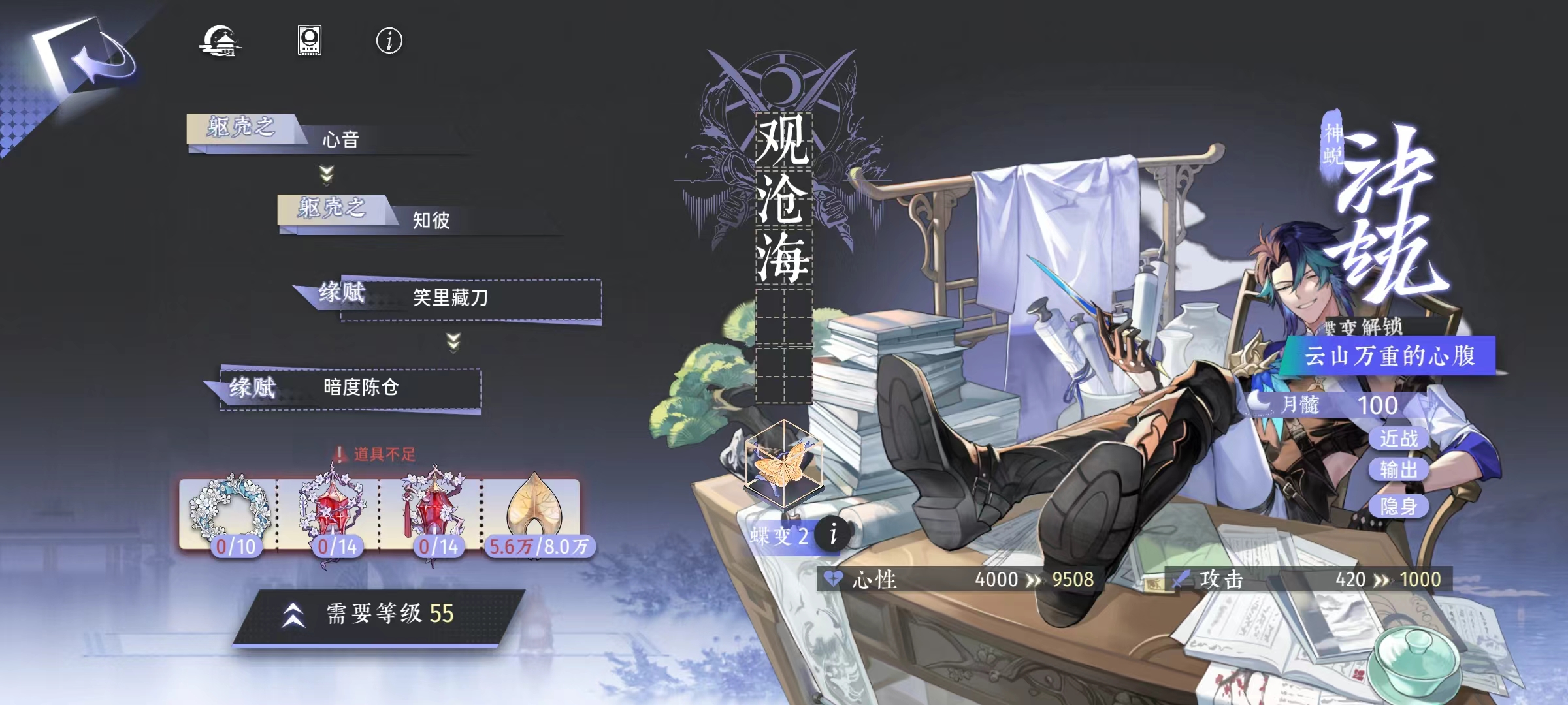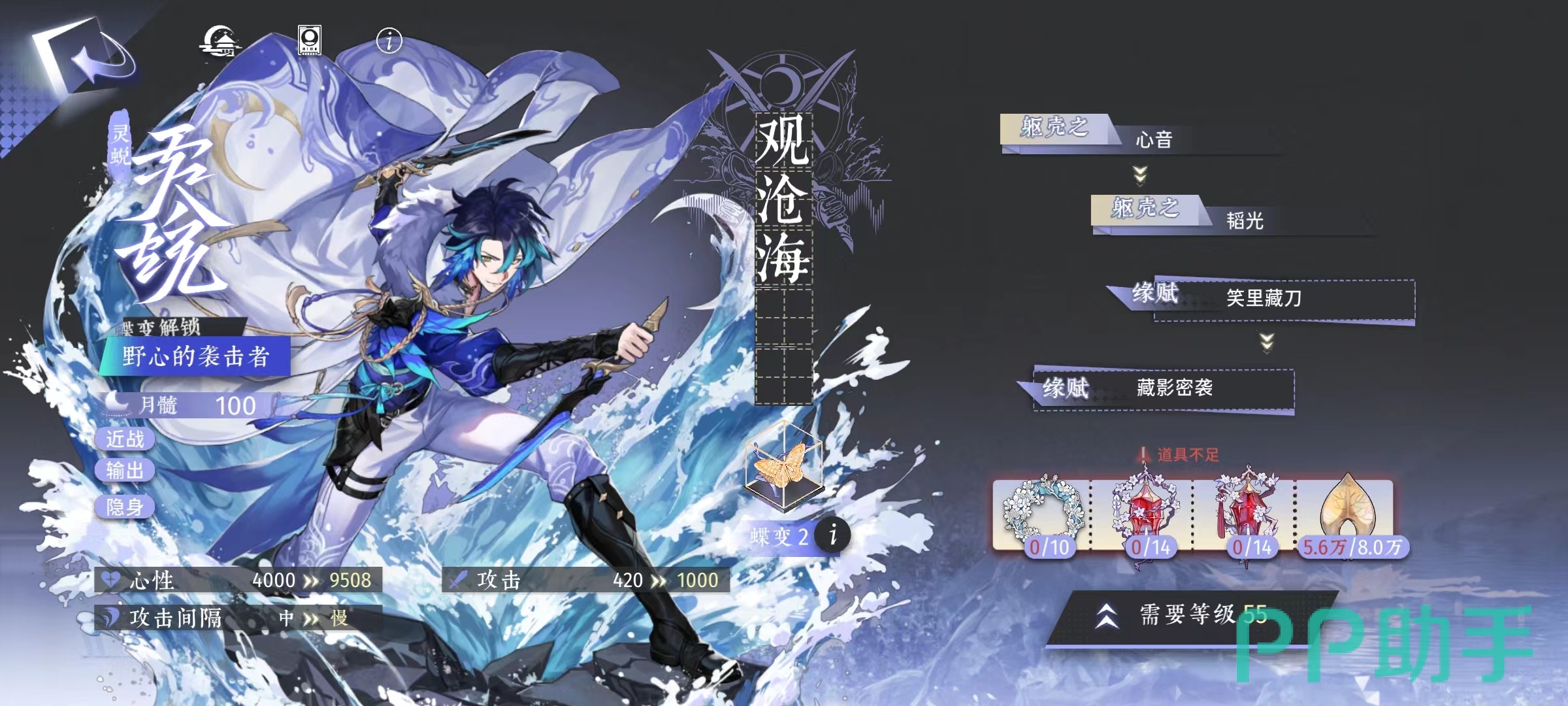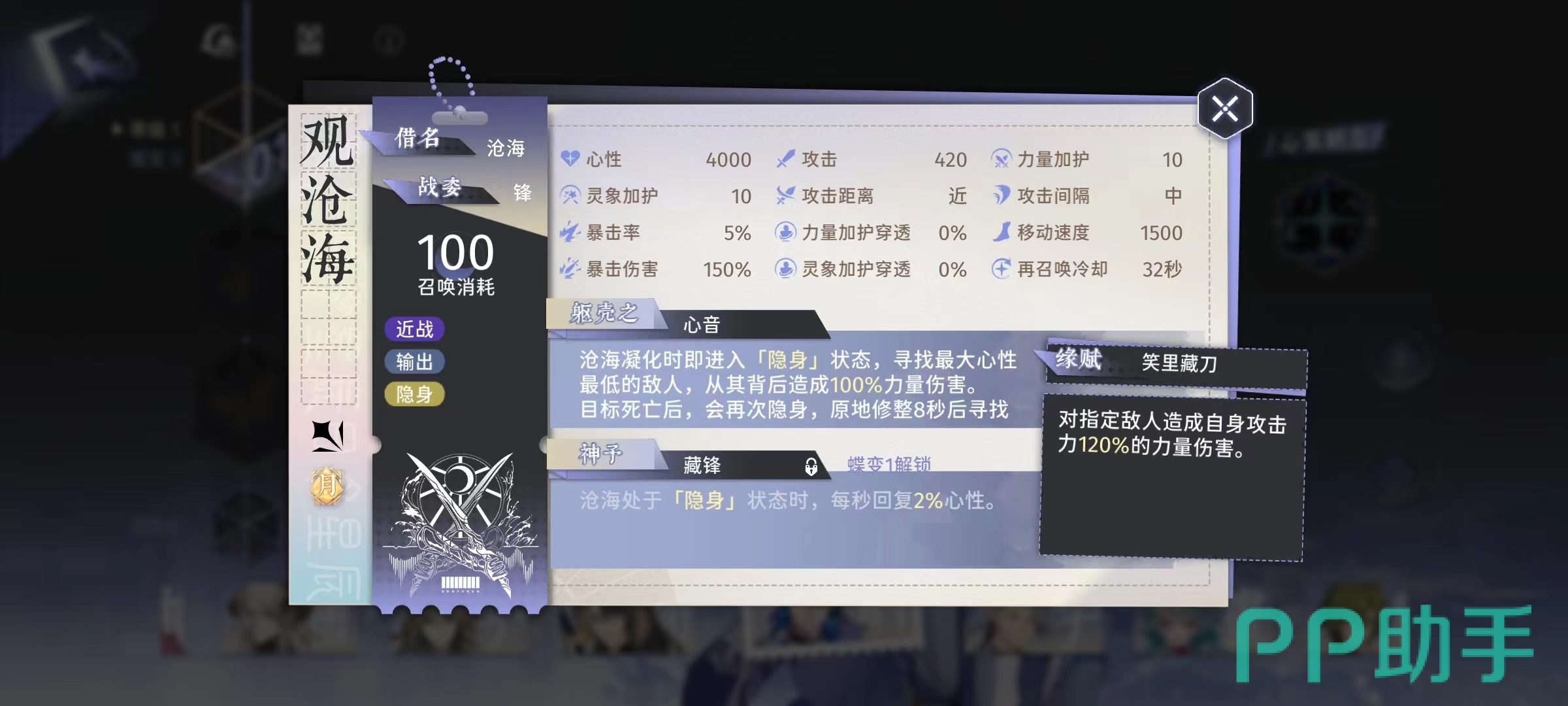 后续达到蝶变1后,解锁神予效果,当沧海处于隐身状态时,能恢复血量,每秒钟恢复2%,如果隐身提前结束了,自然也就不会再回复了。观沧海的缘赋效果是隐谋伺毙,也就是处于支援位置时候的技能,效果是对指定敌方目标,造成攻击力120%的力量伤害。非常简单粗暴,在场外也能贡献自己的力量。在进行蝶变2的时候,有两种不同的可选项,分别是野心的袭击者和云山万重的心腹。