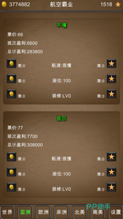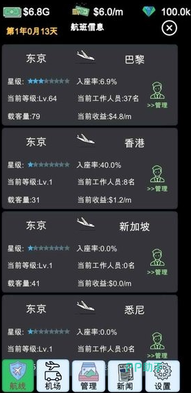 这款游戏是个与航空有关的策略手游,玩起来也不难。在游戏里,我们要做的就是建立飞机的航线,然后靠这个来赚钱,游戏里面有五个不同的剧本,每个时代都有不同的飞机类型,我们要根据实际情况来调整自己的经营策略。可以在游戏里建一个航空公司招点人,选好航线,甚至还能开分公司。如果手里有点闲钱还可以拿去投资,比如买买周边的产业,这样还能吸引更多的旅客来自己的机场。
